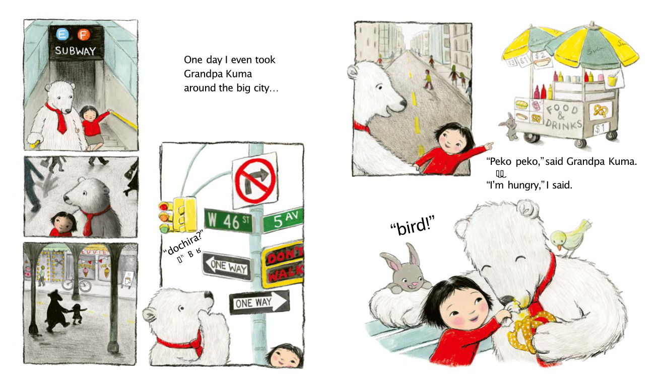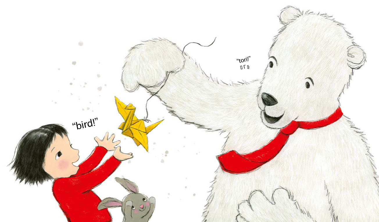 It tells the story of a little girl, Miko, who goes to meet her grandad at the airport. She’s so excited, but when he greets her with “Konnichiwa” she doesn’t know what he’s saying – so they have a problem. They don’t understand each other, so how are they going to play? The story unfolds as Miko and Grandpa each find ways of communicating through card games, origami, meals and trips to the city.